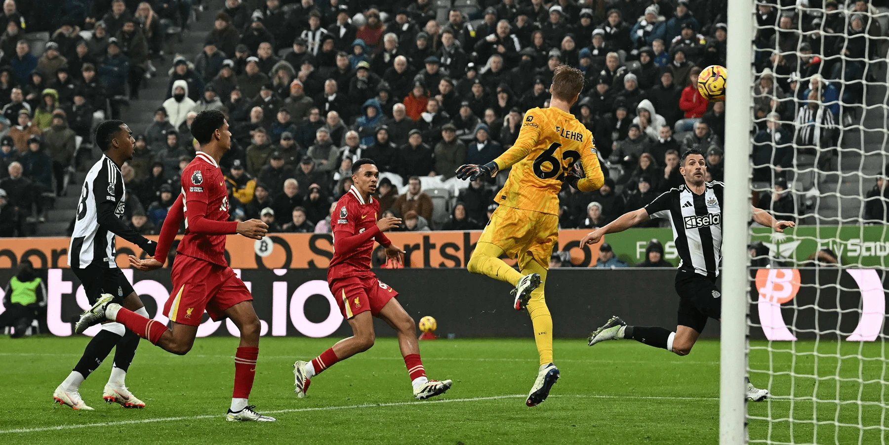 Harvey Barnes melayangkan umpan silang dari sisi kiri. Bola bisa ditanduk Gordon di depan gawang tapi sundulannya masih melambung.